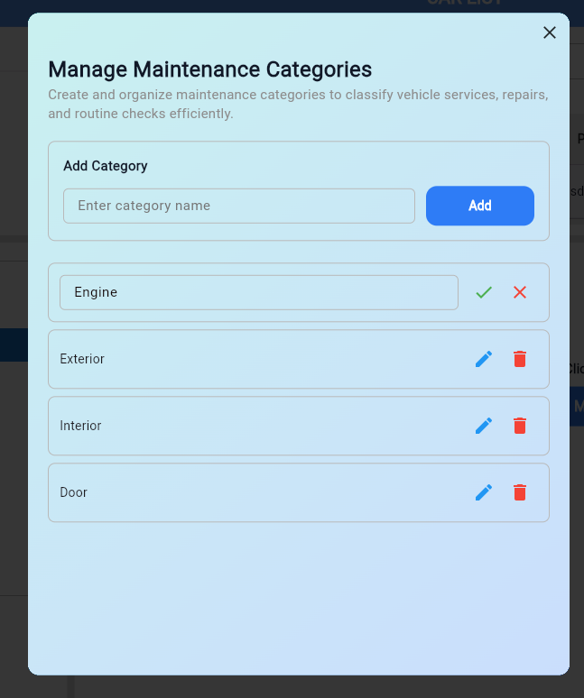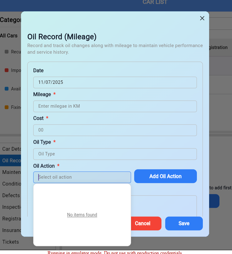 Add an Oil Action Categories section to create and manage categories, and integrate it into the Oil Record section for adding oil records.